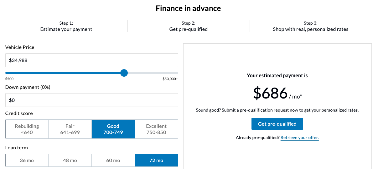 Click “Get pre-qualified” anywhere on our Finance page, or locate the “Finance in advance” section of any vehicle details page, fill in the information requested, and view your pre-qualification offers from our participating lender(s).